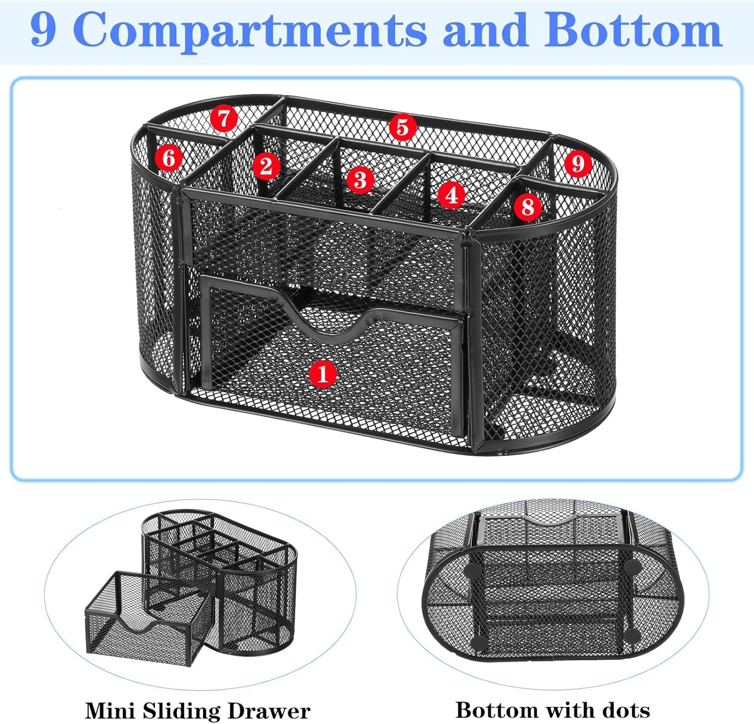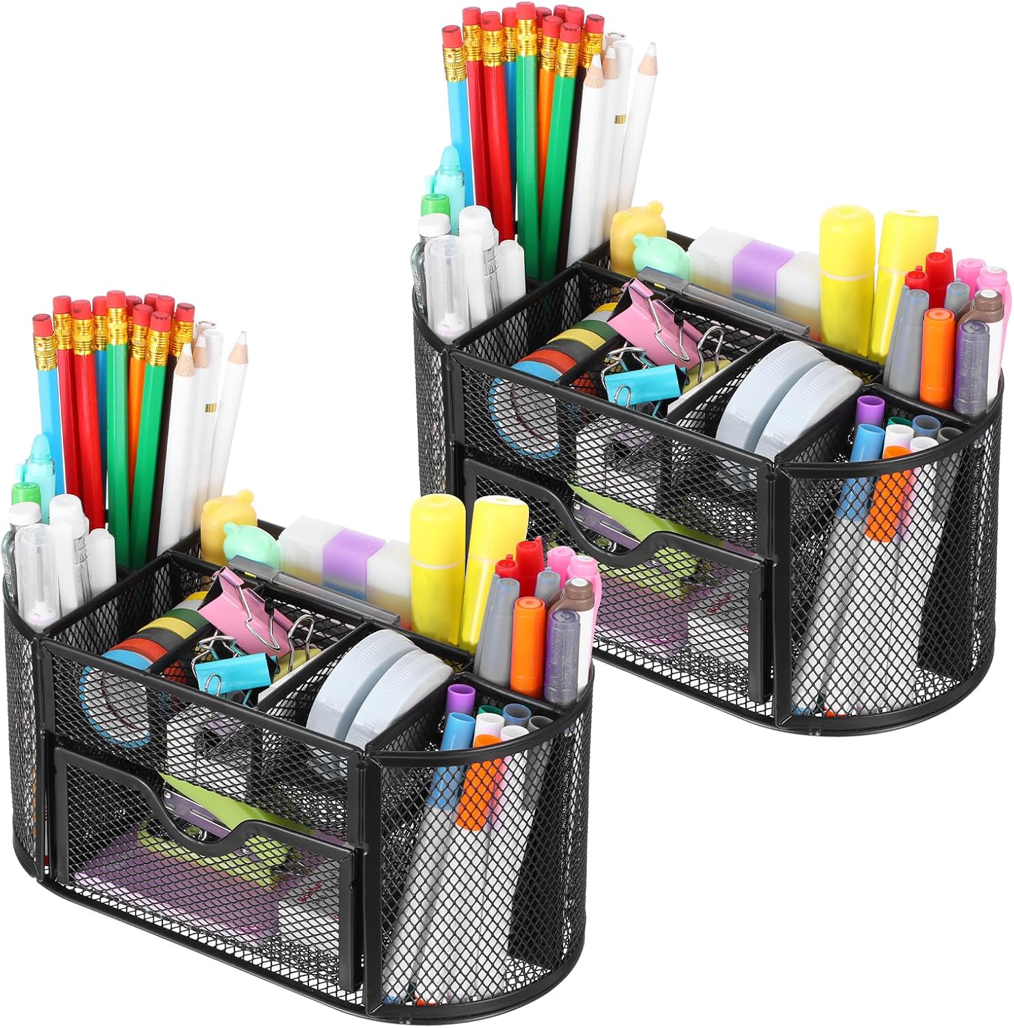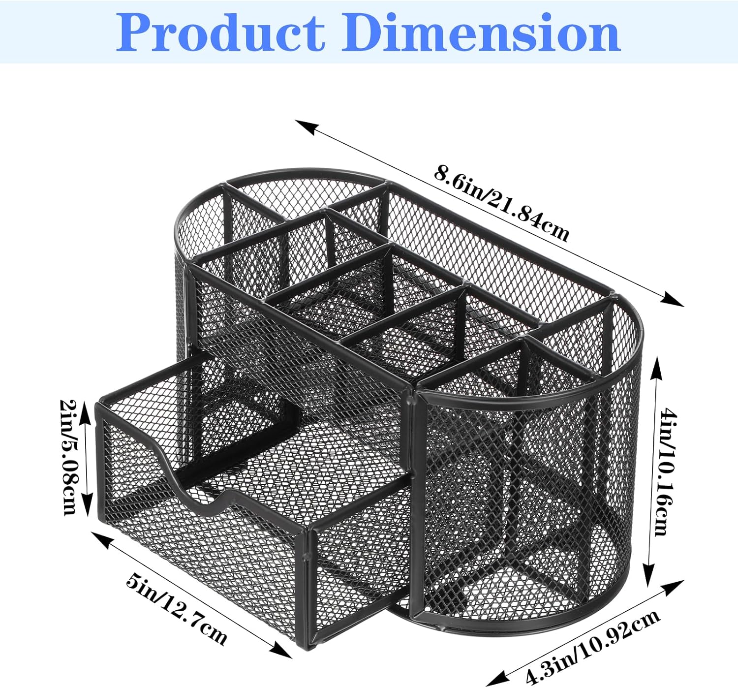 2 Pack Desk Organizer Stationery Storage, Pencil Holder for Desk, Wire Mesh Office Supplies Accessories Workspace Organizers with 9 Compartments and Mini Drawer