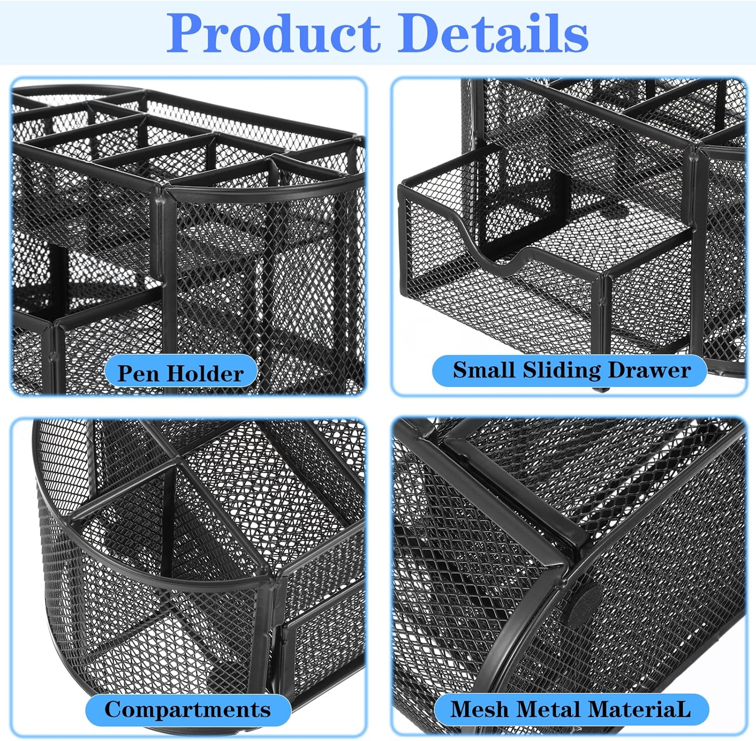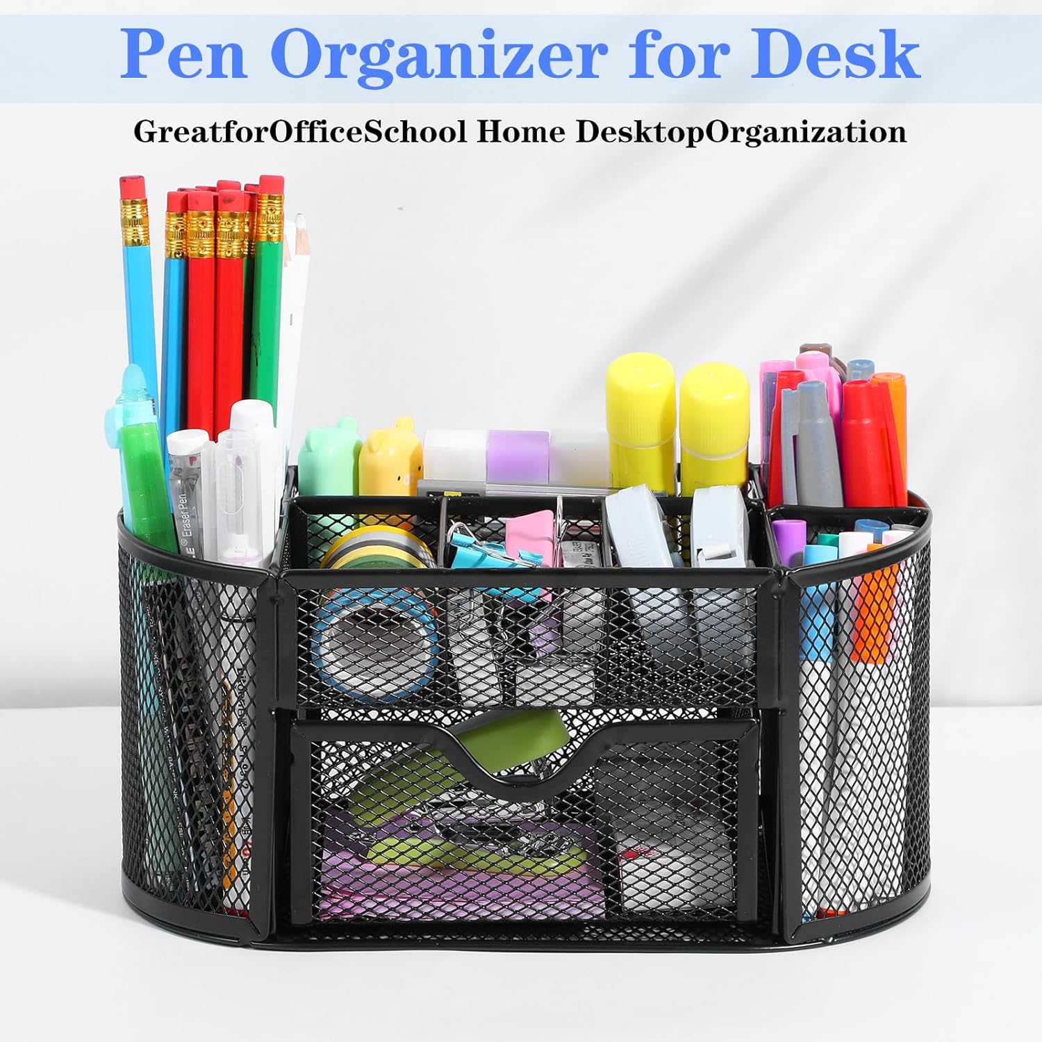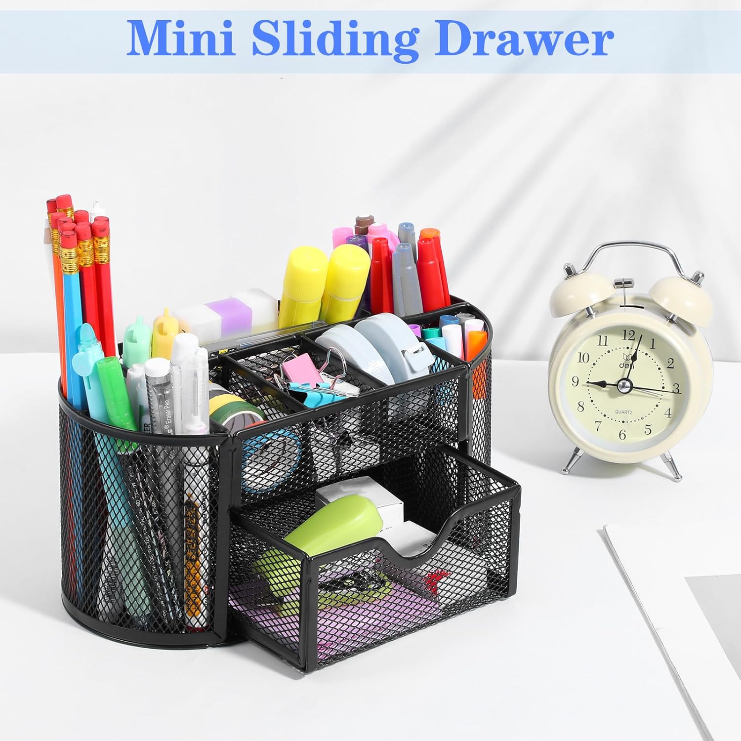 2 Pack Desk Organizer Stationery Storage, Pencil Holder for Desk, Wire Mesh Office Supplies Accessories Workspace Organizers with 9 Compartments and Mini Drawer